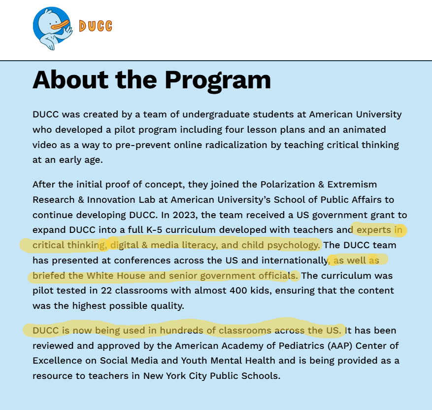 In its “about” page, the team behind DUCC said the curriculum was developed in consultation with child psychologists as well as “digital literacy experts.” PERIL boasted of its close connections to the Biden White House, and noted that DUCC is already active in hundreds of schools.